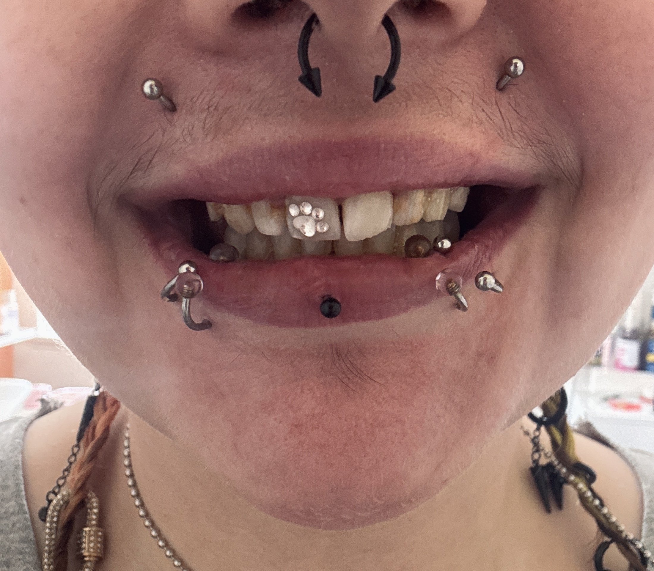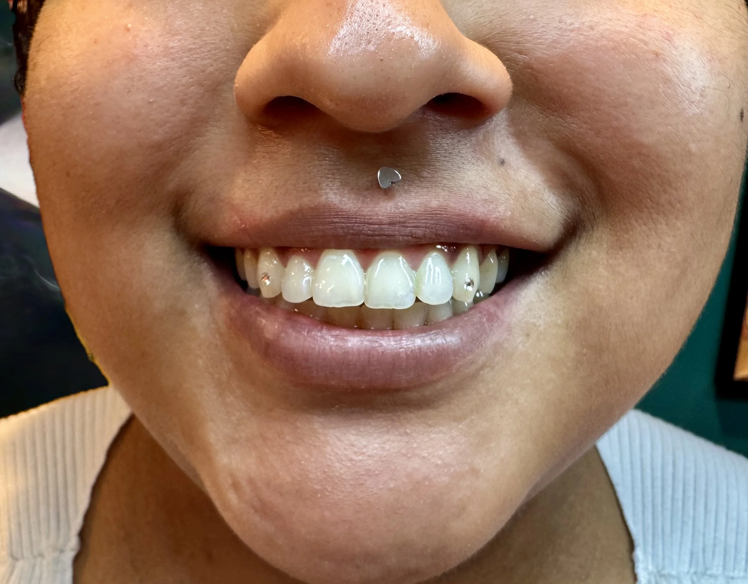 Close-up of a person's smiling face showcasing their teeth with some dental jewelry,